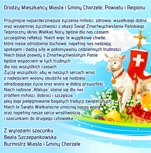 Rozstrzygnięta została III edycja konkursu na „Najpiękniejszą Kartkę Wielkanocną 2021” zorganizowanego przez Beatę Szczepankowską, Burmistrz Miasta i Gminy Chorzele. Konkurs, jak co roku cieszył się ogromnym zainteresowaniem.