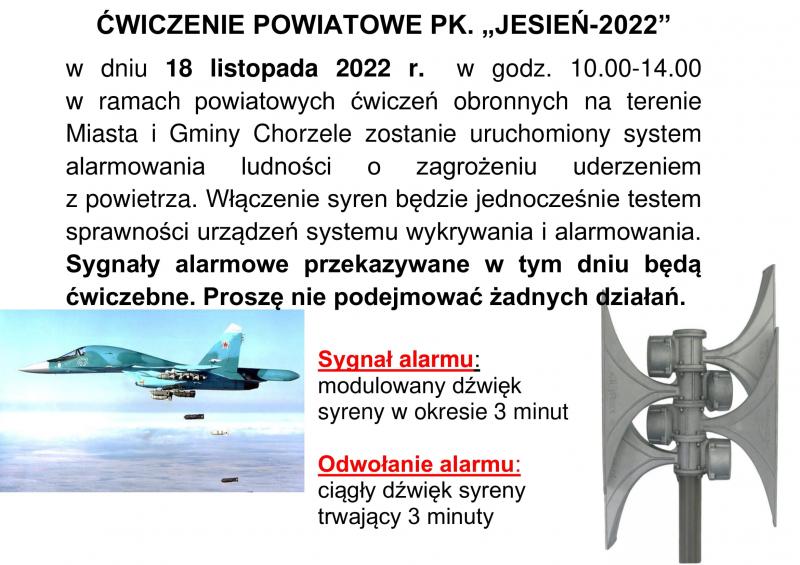 Obrazek W dniu 18 listopada 2022 r. w godz. 10.00-14.00 w ramach powiatowych ćwiczeń obronnych na terenie Miasta i Gminy Chorzele zostanie uruchomiony system alarmowania ludności o zagrożeniu uderzeniem z powietrza. Włączenie syren będzie jednocześnie testem sprawności urządzeń systemu wykrywania i alarmowania.