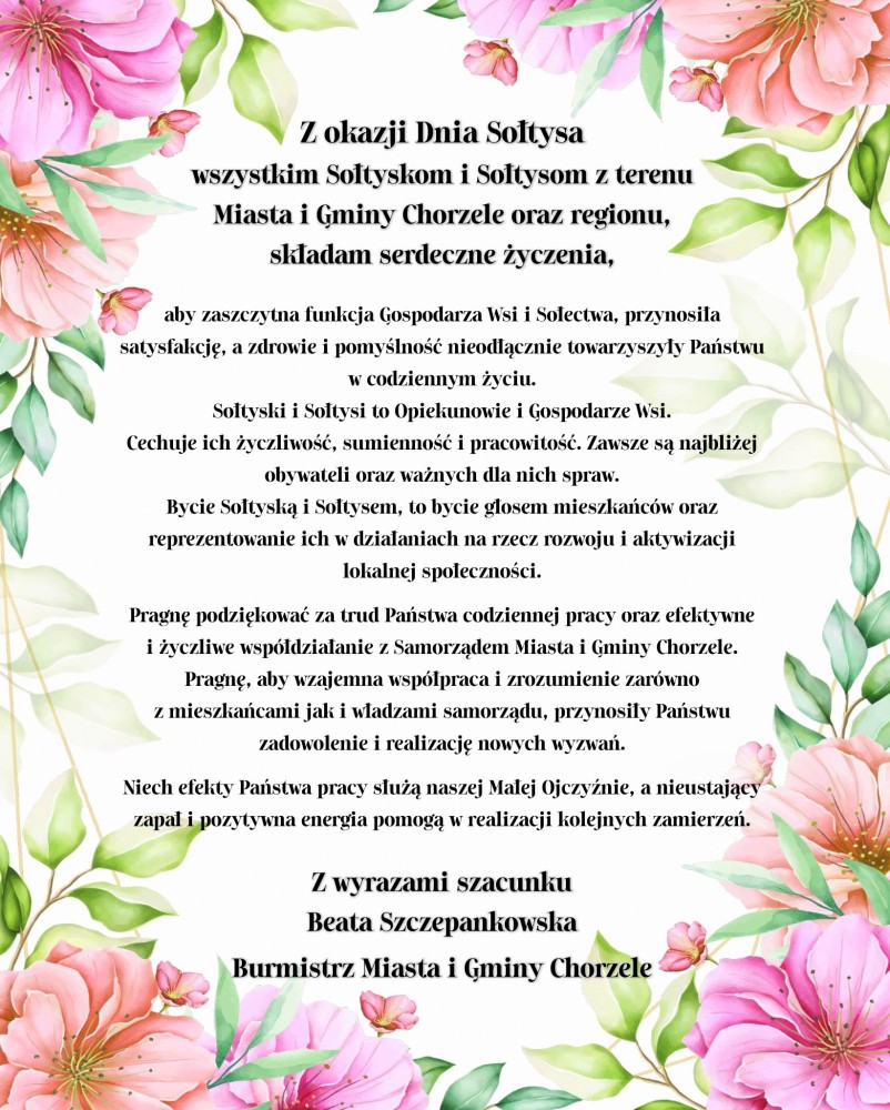 Szanowni Państwo Drodzy Mieszkańcy Miasta i Gminy Chorzele, Powiatu Przasnyskiego oraz Regionu Przyjmijcie najserdeczniejsze życzenia z okazji nadchodzących Świąt.  Życzę Państwu, żebyście przeżyli Wielkanoc w atmosferze szczególneg...