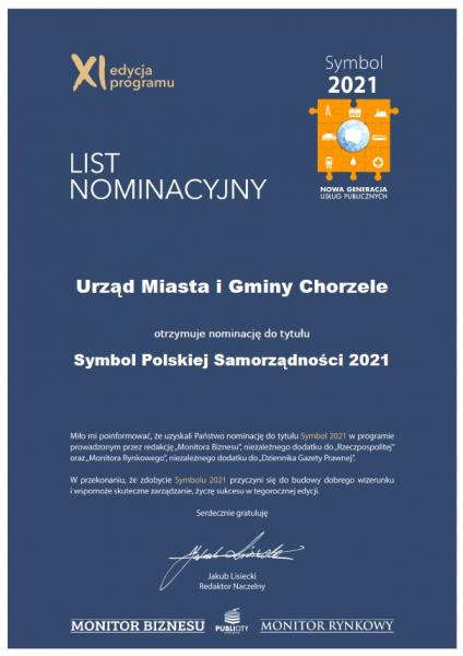 Miło nam poinformować, że na ręce burmistrz Beaty Szczepankowskiej, Miasto i Gmina Chorzele uzyskało nominację do tytułu Symbol Polskiej Samorządności 2021.