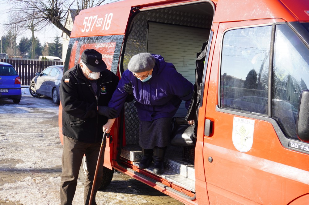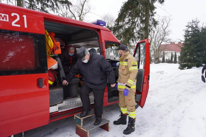 Obrazek Nasi strażacy OSP, we współpracy z burmistrz Beatą Szczepankowską i PSP, dowożą potrzebujących seniorów z terenu Miasta i Gminy Chorzele na szczepienia przeciwko COVID-19. Na zdjęciu OSP Zaręby w akcji pomocy.