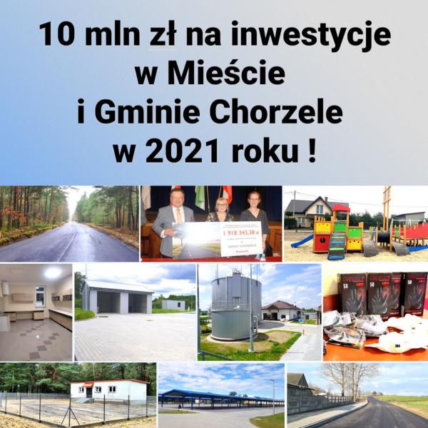 Władze Gminy Chorzele prowadzą obecnie jedne z największych i najliczniejszych inwestycji infrastrukturalnych i społecznych w regionie. Gmina pozyskała na nie wiele środków unijnych i krajowych, a niektóre są dzięki temu budowane ze środków własnych. W roku 2021 duży nacisk będzie niezmiennie kładziony na inwestycje i działania proekologiczne, ochronę środowiska, ale też bezpieczeństwo mieszkańców.
