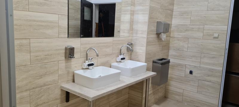 Prace remontowe polegały na wyburzeniu ścian wewnętrznych i dostosowaniu toalet do potrzeb użytkowników. Pomieszczenie zyskało przestrzeń, lepszą ustawność i nowe wyposażenie.