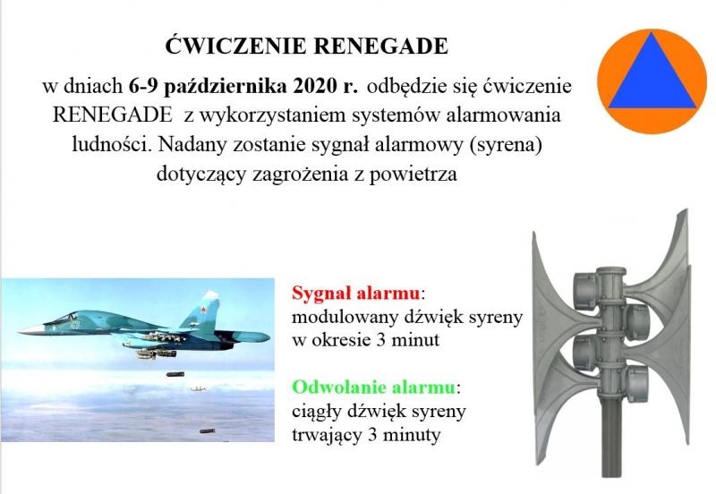 Obrazek ĆWICZENIE RENEGADE w dniach 6-9 października 2020 r.  odbędzie się ćwiczenie RENEGADE z wykorzystaniem systemów alarmowania ludności. Nadany zostanie sygnał alarmowy (syrena) dotyczący zagrożenia z powietrza.