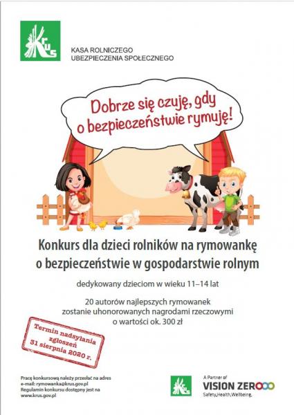 Kasa Rolniczego Ubezpieczenia Społecznego przypomina, że prace na konkurs dla dzieci rolników na rymowankę o bezpieczeństwie w gospodarstwie rolnym można nadsyłać do 31 sierpnia 2020 roku. W konkursie mogą wziąć udział dzieci w wieku 11-14 lat, których przynajmniej jeden rodzic/opiekun prawny podlega ubezpieczeniu społecznemu rolników w okresie przyjmowania zgłoszeń do Konkursu.