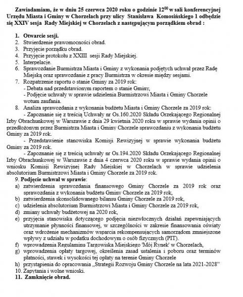 W dniu 25 czerwca 2020 roku o godzinie 1200 w sali konferencyjnej Urzędu Miasta i Gminy w Chorzelach przy ulicy Stanisława Komosińskiego 1 odbędzie się XXIV sesja Rady Miejskiej w Chorzelach.