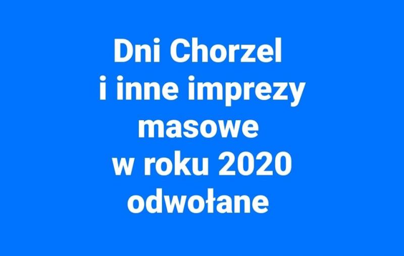 Na wniosek dyrektora Ośrodka Upowszechnienia Kultury w Chorzelach, po przeanalizowaniu sytuacji panującej w kraju, spowodowanej pandemią wywołaną przez COVID-19 oraz realizacją przepisów zawartych w Ustawie z dnia 2 marca 2020 roku o szczególnych rozwiązaniach związanych z zapobieganiem, przeciwdziałaniem i zwalczaniem COVID-19, innych chorób zakaźnych oraz wywołanych nimi sytuacji kryzysowych, jak również w trosce o zdrowie i dobro mieszkańców Miasta i Gminy Chorzele oraz regionu i racjonalną gospodarkę finansami Gminy – burmistrz Miasta i Gminy Chorzele Beata Szczepankowska przychyliła się do prośby dyrektora OUK i wyraziła zgodę na odwołanie masowych imprez kulturalnych, zawartych w kalendarzu imprez zaplanowanych do realizacji przez Ośrodek Upowszechniania Kultury w Chorzelach w roku 2020, w tym Dni Chorzel.