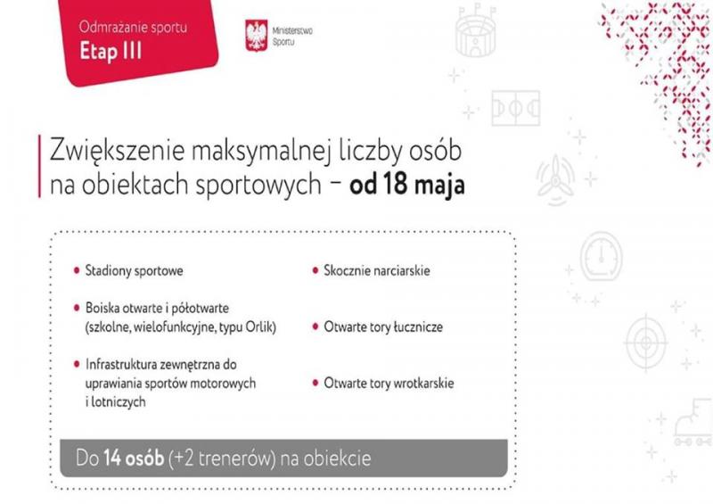 Na obiektach takich jak stadiony sportowe, czy boiska otwarte i półotwarte (szkolne, wielofunkcyjne, typu Orlik), będzie mogło jednocześnie przebywać maksymalnie 14 osób + 2 trenerów.