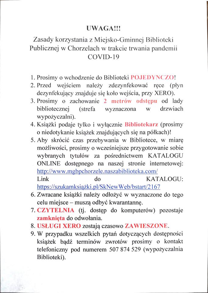 PROSIMY O ZAPOZNANIE SIĘ Z ZASADAMI ZACHOWANIA W BIBLIOTECE NA CZAS TRWANIA PANDEMII