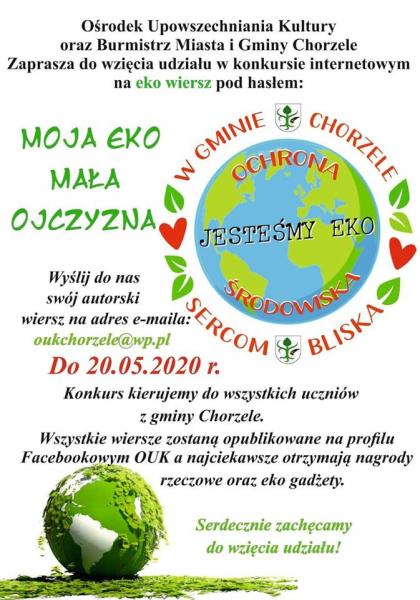 Ośrodek Upowszechniania Kultury i burmistrz Miasta i Gminy Chorzele zapraszają do udziału wszystkich uczniów z terenu gminy Chorzele w konkursie na eko wiersz pod hasłem: „Moja Eko Mała Ojczyzna”. Wiersz jak i podpisane zgody na przetwarzanie danych osobowych (formularz w komentarzu pod postem) prosimy przesyłać na adres e-mail: oukchorzele@wp.pl