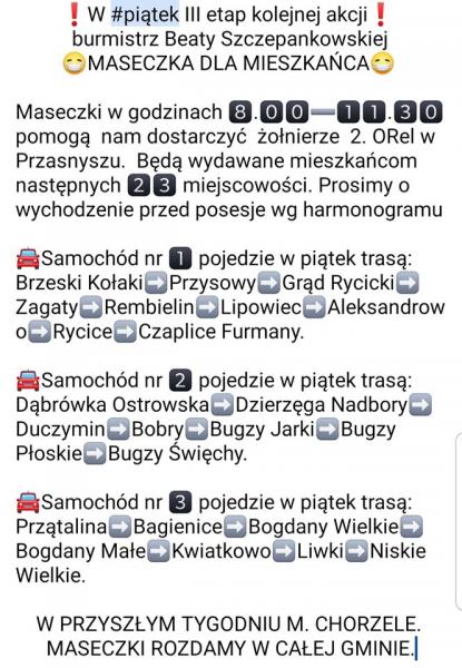 - W środę, dzięki pomocy żołnierzy z przasnyskiej jednostki wojskowej dostarczyliśmy bezpłatne maseczki ochronne wielokrotnego użytku dla mieszkańców kolejnych 25 miejscowości Gminy Chorzele. We wtorek było to 18 miejscowości, a w piątek następne 23 miejscowości. W przyszłym tygodniu Miasto Chorzele.