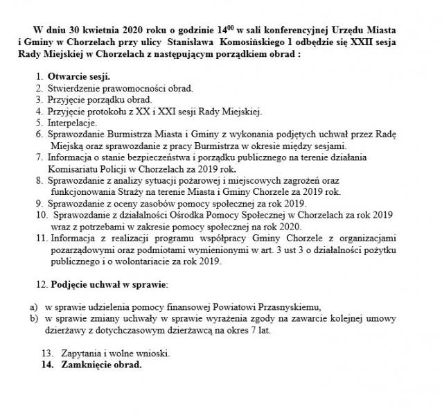 W dniu 30 kwietnia 2020 roku o godzinie 1400 w sali konferencyjnej Urzędu Miasta i Gminy w Chorzelach przy ulicy  Stanisława  Komosińskiego 1 odbędzie się XXII sesja Rady Miejskiej w Chorzelach.