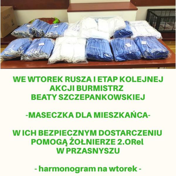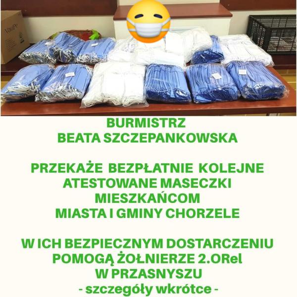 Burmistrz Miasta i Gminy Chorzele Beata Szczepankowska informuje, że zgodnie z zapowiedzią, we wtorek 21 kwietnia rusza I etap rozdawania przez żołnierzy przasnyskiej jednostki wojskowej, zakupionych przez Urząd Miejski w Chorzelach bezpłatnych maseczek ochronnych dla mieszkańców Miasta i Gminy Chorzele.