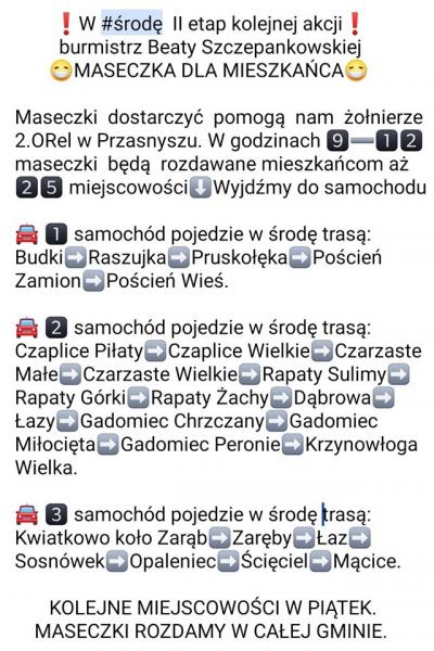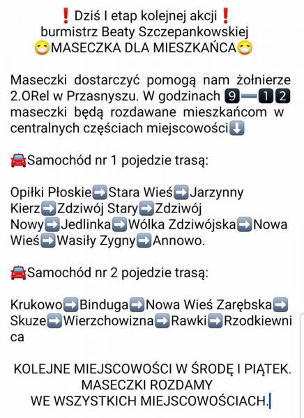 Niżej wykaz miejscowości, mieszkańcom których burmistrz wraz z żołnierzami przasnyskiej jednostki wojskowej przekaże maseczki we #wtorek. Komunikat dostarczania maseczek w środę i piątek ukaże się dzień wcześniej. Maseczki zostaną dostarczone do wszystkich miejscowości.
