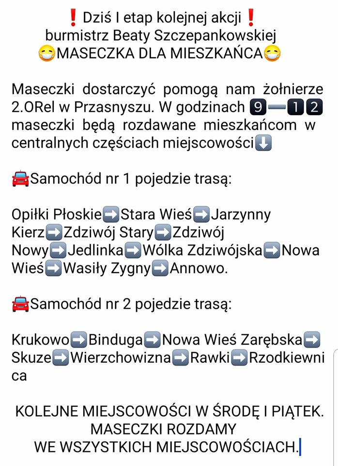 ❗Niżej wykaz miejscowości, mieszkańcom których burmistrz wraz z żołnierzami przasnyskiej jednostki wojskowej przekaże maseczki we #wtorek. Komunikat dostarczania maseczek w środę i piątek ukaże się dzień wcześniej. Maseczki zostaną dostarczone do wszystkich miejscowości.