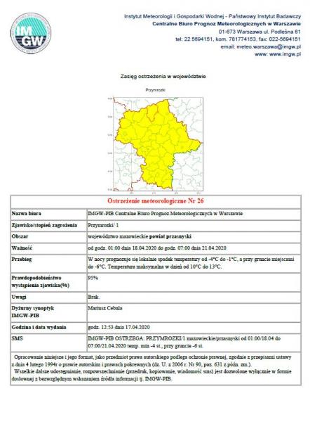Obrazek Ostrzeżenie meteorologiczne nr 26 IMGW-PIB Centralne Biuro Prognoz Meteorologicznych w Warszawie. więcej
