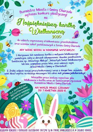 Aby umilić czas naszym dzieciakom i zrobić w tym szczególnym czasie coś wspólnego, ogłaszamy konkurs na Najpiękniejszą Kartkę Wielkanocną 2020. Wszystkie zdjęcia kartek nadesłane do 7 kwietnia b.r. na messengera FB Urzędu Gminy oraz e- mail: promocja@chorzele.pl zostaną rozesłane, jako Wielkanocne e-kartki wraz ze Świątecznymi życzeniami Burmistrz Miasta i Gminy Chorzele Beaty Szczepankowskiej. Wszystkie zostaną też opublikowane na stronie i FB Urzędu. Nagrodami za zajęcie miejsc I-III w każdej kategorii, będą gry planszowe.