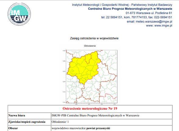 Obrazek Ostrzeżenie meteorologiczne nr 19 IMGW-PiB Centralne Biuro Prognoz Meteorologicznych w Warszawie.  więcej