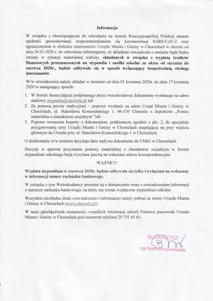W związku z Rozporządzeniem Ministra Zdrowia z dnia 20 marca 2020 r. w sprawie ogłoszenia na obszarze Rzeczypospolitej Polskiej stanu epidemii ( Dz.U. z 2020 r. poz. 491 i 522) tj. z uwagi na ogłoszenie na obszarze Rzeczypospolitej Polskiej stanu epidemii w związku z zakażeniami wirusem SARS-CO V-2 oraz, w związku z Zarządzeniem Burmistrza Miasta i Gminy Chorzele nr 34/2020 z dnia 24 marca 2020 r.  w sprawie ograniczenia wykonywania zadań przez Urząd Miasta i Gminy w Chorzelach, w związku z ogłoszeniem na obszarze Rzeczypospolitej Polskiej stanu epidemii tj. załatwiania spraw w Urzędzie Miasta i Gminy w Chorzelach elektronicznie lub telefonicznie od dnia 26 marca 2020 r. do odwołania, zgłoszenia na członków Obwodowych Komisji Wyborczych w wyborach Prezydenta Rzeczypospolitej Polskiej zarządzonych na dzień 10 maja 2020 r. należy w terminie do 10 kwietnia 2020 r. :