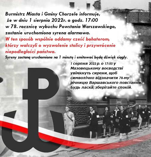1 серпня 2022 р. о 17:00 у Мазовецькому воєводстві увімкнуть сирени, щоб символічно відзначити 78-му річницю Варшавського повстання. Будь ласка, зберігайте спокій.