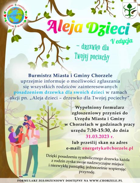 Obrazek Burmistrz Miasta i Gminy Chorzele uprzejmie informuje o możliwości zgłaszania się wszystkich rodziców zainteresowanych posadzeniem drzewka dla swoich dzieci w ramach akcji pn.: "Aleja dzieci - drzewko dla Twojej pociechy".