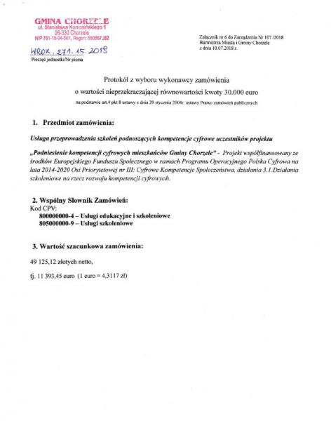 Protokół z wyboru wykonawcy zamówienia "Usługa przeprowadzenia szkoleń podnoszących kompetencje cyfrowe uczestników projektu "Podniesienie kompetencji cyfrowych mieszkańców Gminy Chorzele".