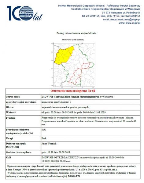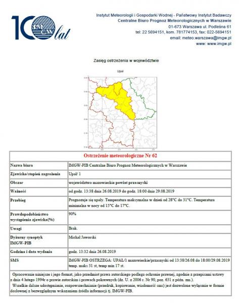 Ostrzeżenie meteorologiczne nr 62 IMGW-PIB Cenralne Biuro Prognoz Meteorologicznych w Warszawie.