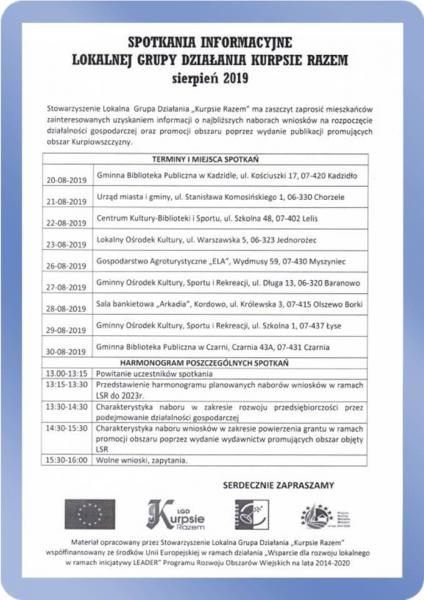 Stowarzyszenie Lokalna Grupa Działania "Kurpsie Razem" ma zaszczyt zaprosić mieszkańców zainteresowanych uzyskaniem informacji o najbliższych naborach wniosków na rozpoczecie działalności gospodarczej oraz promocji obszaru poprzez wydanie publikacji promujących obszar Kurpiowszczyzny. Spotkanie odbędzie się w dniu dzisiejszym w siedzibie Urzędu Miasta i Gminy w Chorzelach o godz 13:00. Zapraszamy serdecznie!!!