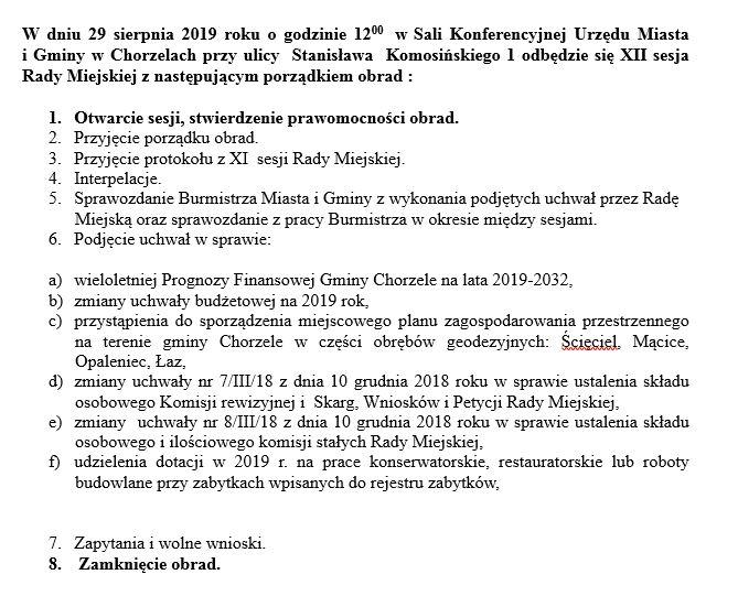 Obrazek Wdniu 29 sierpnia 2019 roku o godzinie 1200  w Sali Konferencyjnej Urzędu Miasta i Gminy w Chorzelach przy ulicy  Stanisława  Komosińskiego 1 odbędzie się XII sesja Rady Miejskiej w Chorzelach. więcej