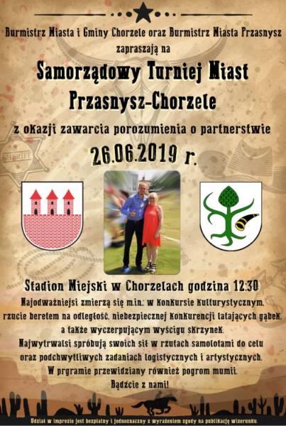 Burmistrz Miasta i Gminy Chorzele oraz Burmistrz Miasta Przasnysz zapraszają na Samorządowy Turniej Miast Przasnysz - Chorzele z okazji zawarcia porozumienia o partnerstwie, który odbędzie się 26 czerwca 2019 r. o godz. 12:30 na Stadionie Miejskim w Chorzelach.