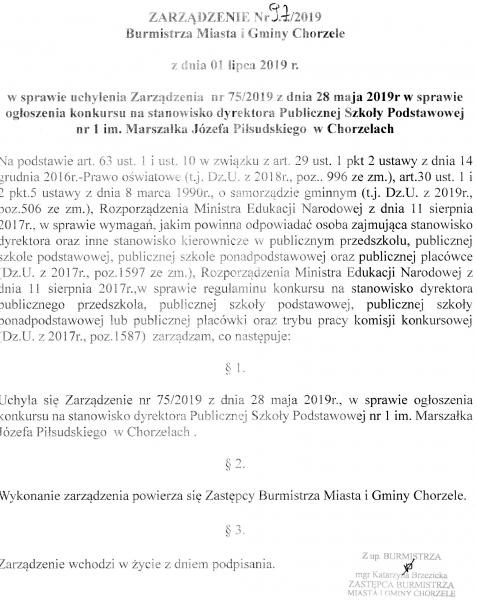 Zarządzenie nr 97/2019 Burmistrza Miasta i Gminy Chorzele z dnia 1 lipca 2019r. w sprawie uchylenia Zarządzenia nr 75/2019 z dnia 28 maja 2019r. w sprawie ogłoszenia konkursu na stanowisko dyrektora Publicznej Szkoły Podstawowej nr 1 im. Marszałka Józefa Piłsudskiego w Chorzelach.