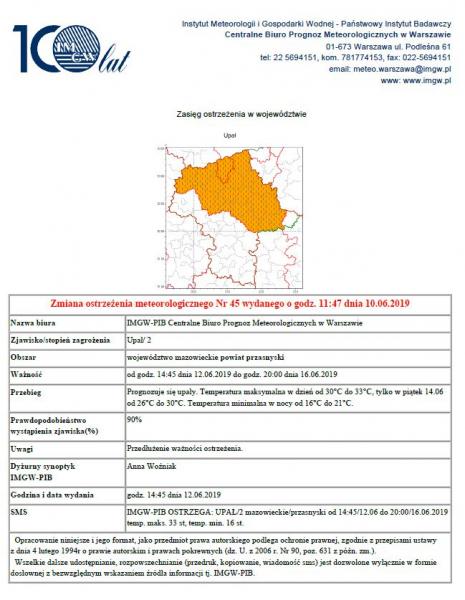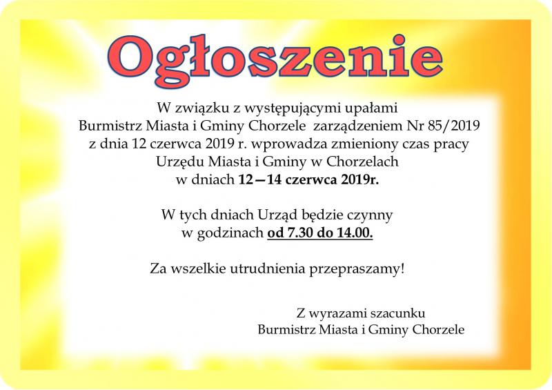 W związku z występującymi upałami Burmistrz Miasta i Gminy Chorzele zarządzeniem Nr 85/2019 z dnia 12 czerwca 2019 r. wprowadza zmieniony czas pracy Urzędu Miasta i Gminy w Chorzelach w dniach 12—14 czerwca 2019r.