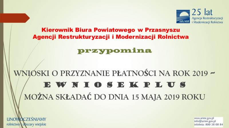 Kierownik Biura Powiatowego w Przasnyszu Agencji Restrukturyzacji i Modernizacji Rolnictwa przypomina o składaniu wniosków odnośnie przyznania płatności na 2019 rok.