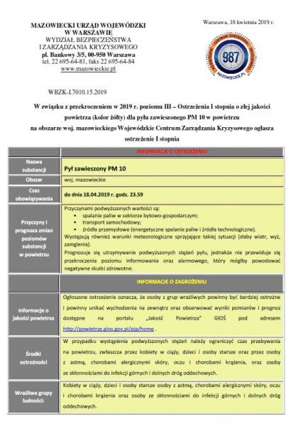 W związku z przekroczeniem w 2019 r. poziomu III – Ostrzeżenia 1 stopnia o złej jakości powietrza (kolor żółty) dla pyłu zawieszonego PM 2,5 w powietrzu na obszarze województwa mazowieckiego Wojewódzkie Centrum Zarządzania Kryzysowego ogłasza ostrzeżenie 1 stopnia