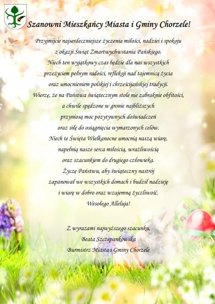 Szanowni Państwo Drodzy Mieszkańcy Miasta i Gminy Chorzele, Powiatu Przasnyskiego oraz Regionu Przyjmijcie najserdeczniejsze życzenia z okazji nadchodzących Świąt.  Życzę Państwu, żebyście przeżyli Wielkanoc w atmosferze szczególneg...