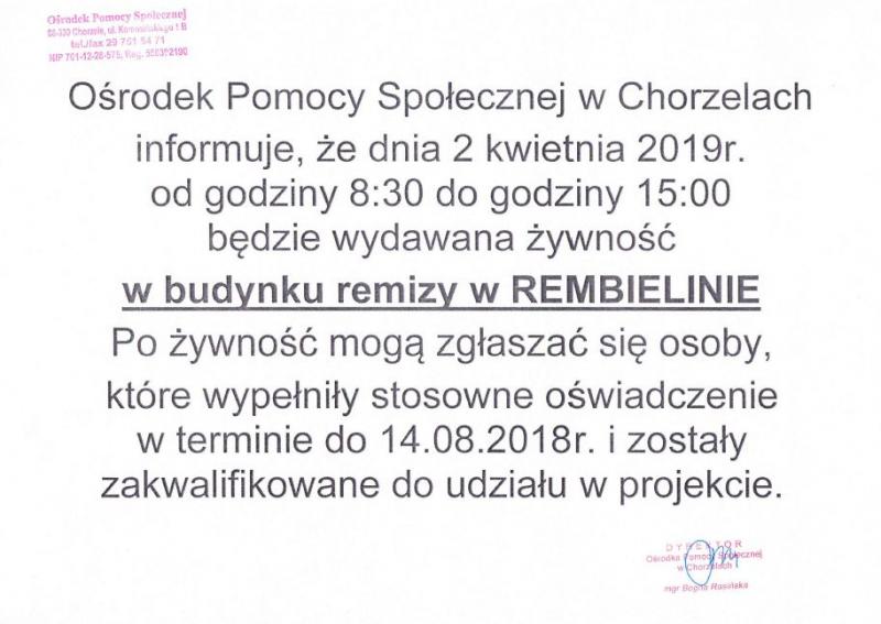 Ośrodek Pomocy Społecznej w Chorzelach informuje, że dnia 2 kwietnia 2019r. od godziny 8:30 do godziny 15:00 będzie wydawana żywność w budynku remizy w Rembielinie. Po żywność mogą zgłaszać się osoby, które wypełniły stosowne oświadczenie w terminie do 14.08.2018r. i zostały zakwalifikowane do udziału w projekcie.