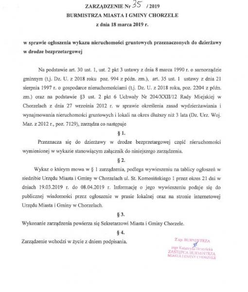 Zarządzenie nr 35/2019 Burmistrza Miasta i Gminy Chorzele z dnia 18 marca 2019r. w sprawie ogłoszenia wykazu nieruchomości gruntowych przeznaczonych do dzierżawy w drodze bezprzetargowej.