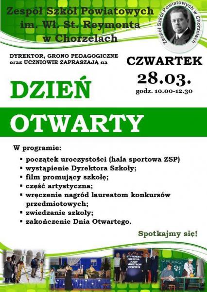więcejDyrektor, Grono Pedagogiczne oraz Uczniowie Zespołu Szkół Powiatowych im. Wł. St. Reymonta w Chorzelach serdecznie zapraszają na dzień otwarty, który odbędzie się 28 marca (czwartek) od godz. 10.00 do godz. 12.30.