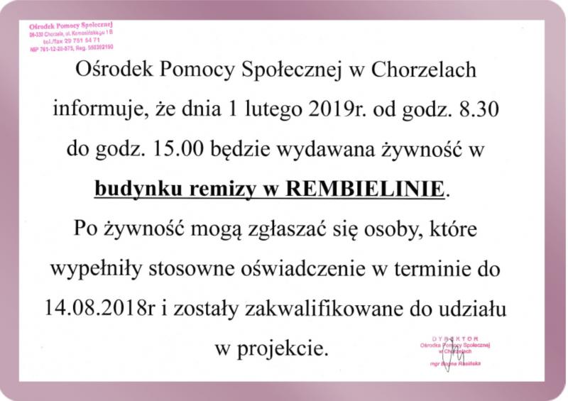 Obrazek Ośrodek Pomocy Społecznej w Chorzelach informuje, że dnia 1 lutego 2019r. od godz. 8.30 do godz. 15.00 będzie wydawana żywność w budynku remizy w Rembielinie. więcej