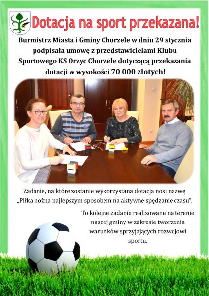 Burmistrz Miasta i Gminy Chorzele w dniu 29 stycznia podpisała umowę z przedstawicielami Klubu Sportowego KS Orzyc Chorzele dotyczącą przekazania  dotacji w wysokości 70 000 złotych!
