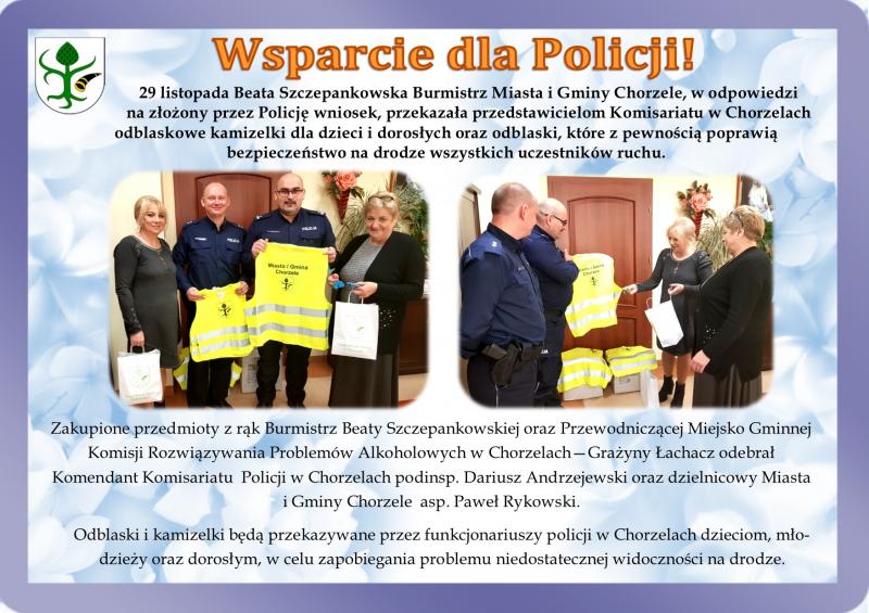 29 listopada Beata Szczepankowska Burmistrz Miasta i Gminy Chorzele, w odpowiedzi na złożony przez Policję wniosek, przekazała przedstawicielom Komisariatu w Chorzelach odblaskowe kamizelki dla dzieci i dorosłych oraz odblaski, które z pewnością poprawią  bezpieczeństwo na drodze wszystkich uczestników ruchu.