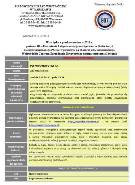 W związku z przekroczeniem w 2018 r. poziomu III – Ostrzeżenia I stopnia o złej jakości powietrza (kolor żółty) dla pyłu zawieszonego PM 2,5 w powietrzu na obszarze woj. mazowieckiego Wojewódzkie Centrum Zarządzania Kryzysowego ogłasza ostrzeżenie I stopnia.