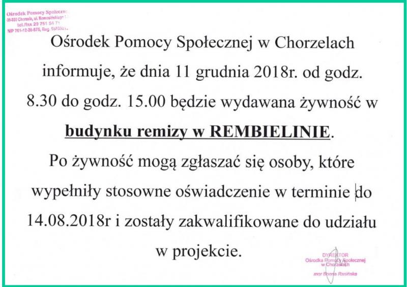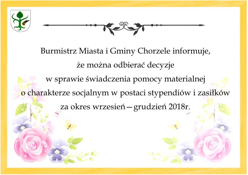 Burmistrz Miasta i Gminy Chorzele informuje, że można odbierać decyzje w sprawie świadczenia pomocy materialnej o charakterze socjalnym w postaci stypendiów i zasiłków za okres wrzesień—grudzień 2018r.