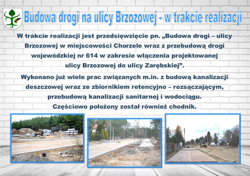 W trakcie realizacji jest przedsięwzięcie pn. "Budowa drogi - ulicy Brzozowej w miejscowości Chorzele wraz z przebudową drogi wojewódzkiej nr 614 w zakresie włączenia projektowanej ulicy Brzozowej do ulicy Zarębskiej".
