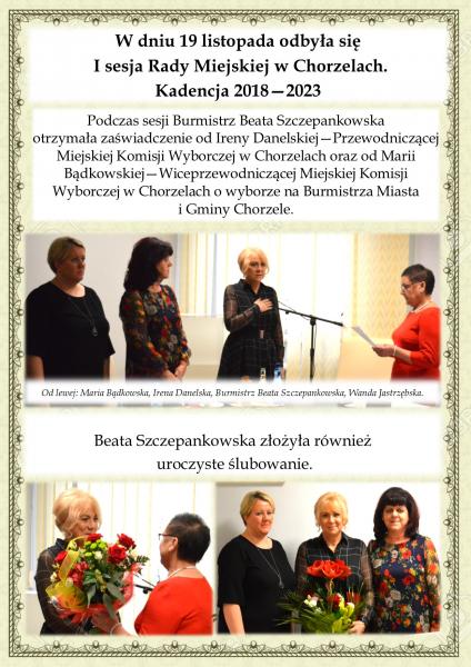 Podczas sesji Burmistrz Beata Szczepankowska otrzymała zaświadczenie od Ireny Danelskiej — Przewodniczącej Miejskiej Komisji Wyborczej w Chorzelach oraz od Marii Bądkowskiej— Wiceprzewodniczącej Miejskiej Komisji Wyborczej w Chorzelach o wyborze na Burmistrza Miasta i Gminy Chorzele.