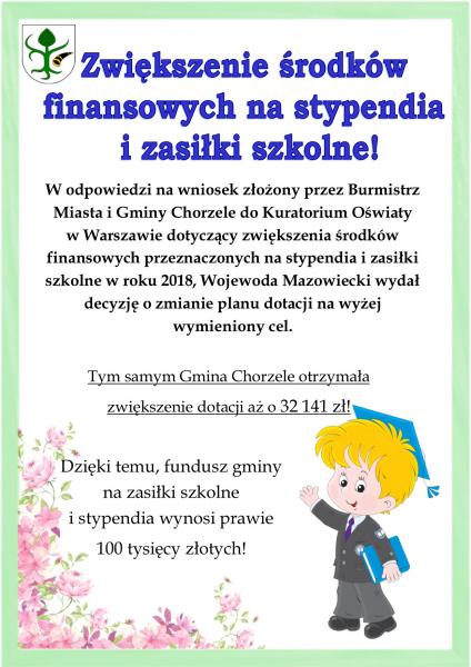 W odpowiedzi na wniosek złożony przez Burmistrz Miasta i Gminy Chorzele do Kuratorium Oświaty w Warszawie dotyczący zwiększenia środków finansowych przeznaczonych na stypendia i zasiłki szkolne w roku 2018, Wojewoda Mazowiecki wydał decyzję o zmianie planu dotacji na wyżej wymieniony cel.
