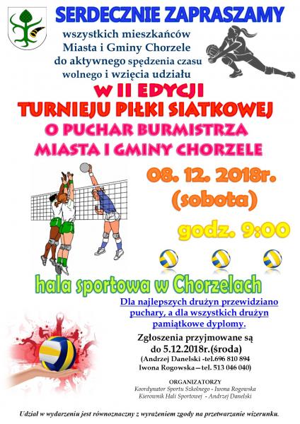 Obrazek Serdecznie zapraszamy wszystkich mieszkańców Miasta i Gminy Chorzele do aktywnego spędzenia czasu wolnego i wzięcia udziału w II edycji Turnieju Piłki Siatkowej o Puchar Burmistrza Miasta i Gminy Chorzele! więcej