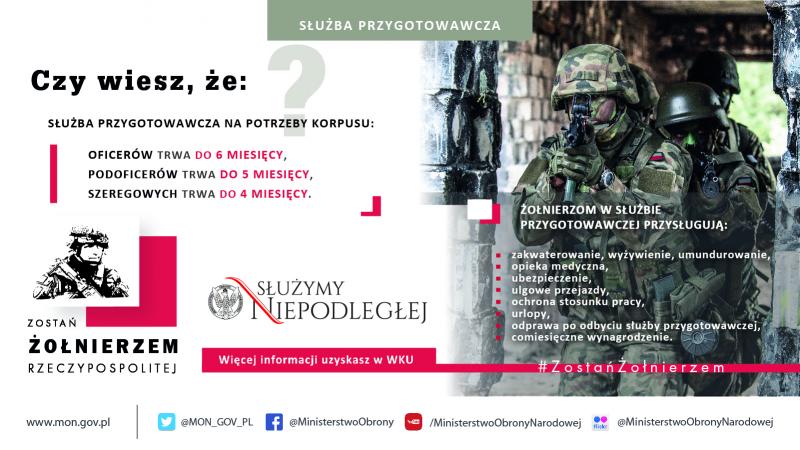 Najbliższe spotkanie z przedstawicielami WKU w Ostrołęce, 2 ORel w Przasnyszu oraz 5 MBOT w Ciechanowie odbędzie się w dniach 24-25.10.2018 w godz. 14.00 – 19.00 w Galerii Stokrotka, ul. Orlika 18, 06-300 Przasnysz Przedstawiciele WKU i JW przedstawią możliwe formy odbywania służby wojskowej. Wszystkich chętnych zapraszamy.
