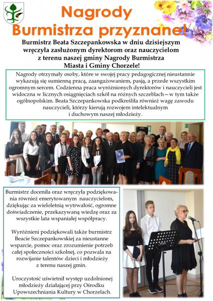 Burmistrz Beata Szczepankowska w dniu dzisiejszym wręczyła zasłużonym dyrektorom oraz nauczycielom z terenu naszej gminy Nagrody Burmistrza Miasta i Gminy Chorzele! Nagrody otrzymały osoby, które w swojej pracy pedagogicznej nieustannie wykazują się sumienną pracą, zaangażowaniem, pasją, a przede wszystkim ogromnym sercem. Codzienna praca wyróżnionych dyrektorów i nauczycieli jest widoczna w licznych osiągnięciach szkół na różnych szczeblach—w tym także ogólnopolskim.