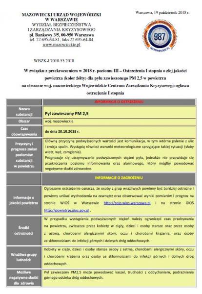 W związku z przekroczeniem w 2018 r. poziomu III – Ostrzeżenia I stopnia o złej jakości powietrza (kolor żółty) dla pyłu zawieszonego PM 10 w powietrzu na obszarze woj. mazowieckiego Wojewódzkie Centrum Zarządzania Kryzysowego ogłasza ostrzeżenie I stopnia.